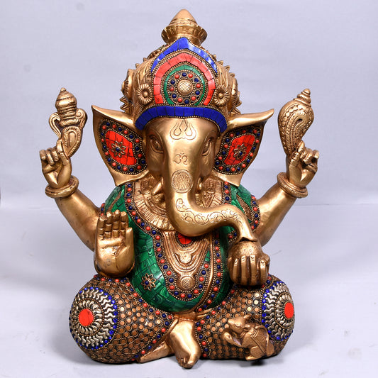 Brass Ring Work Ganesha Sitting On Lotus (10.5 In)