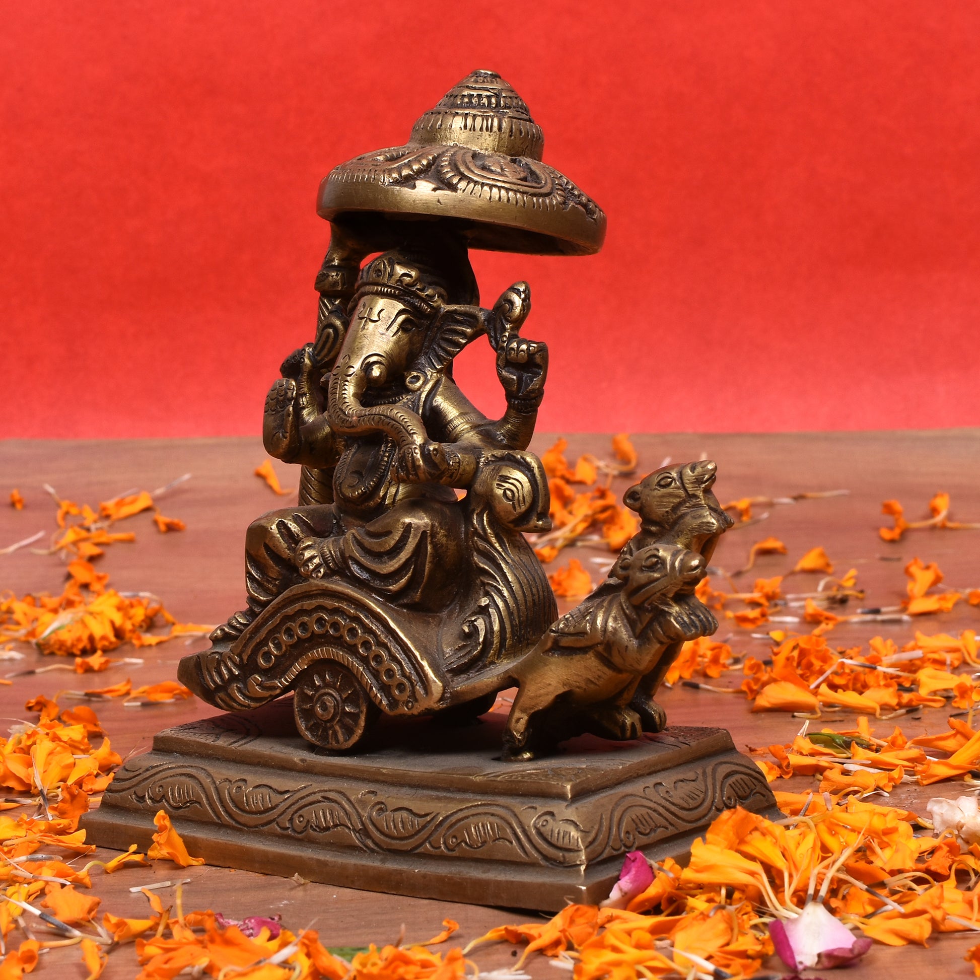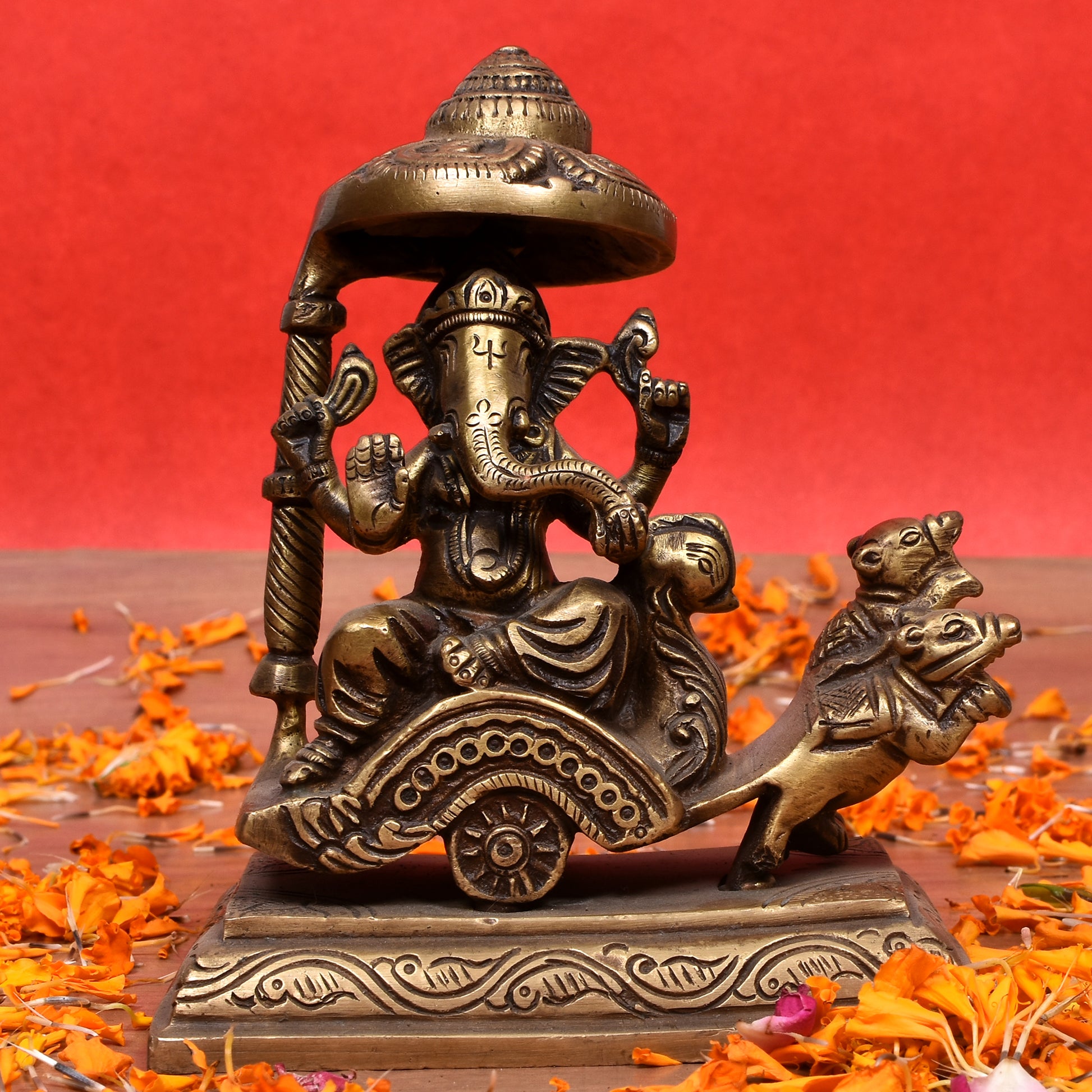 This exquisite figurine captures Lord Ganesha, the revered God of New Beginnings, Wisdom, and the Remover of Obstacles (Vighnaharta), seated majestically upon a Rath or ceremonial chariot.
