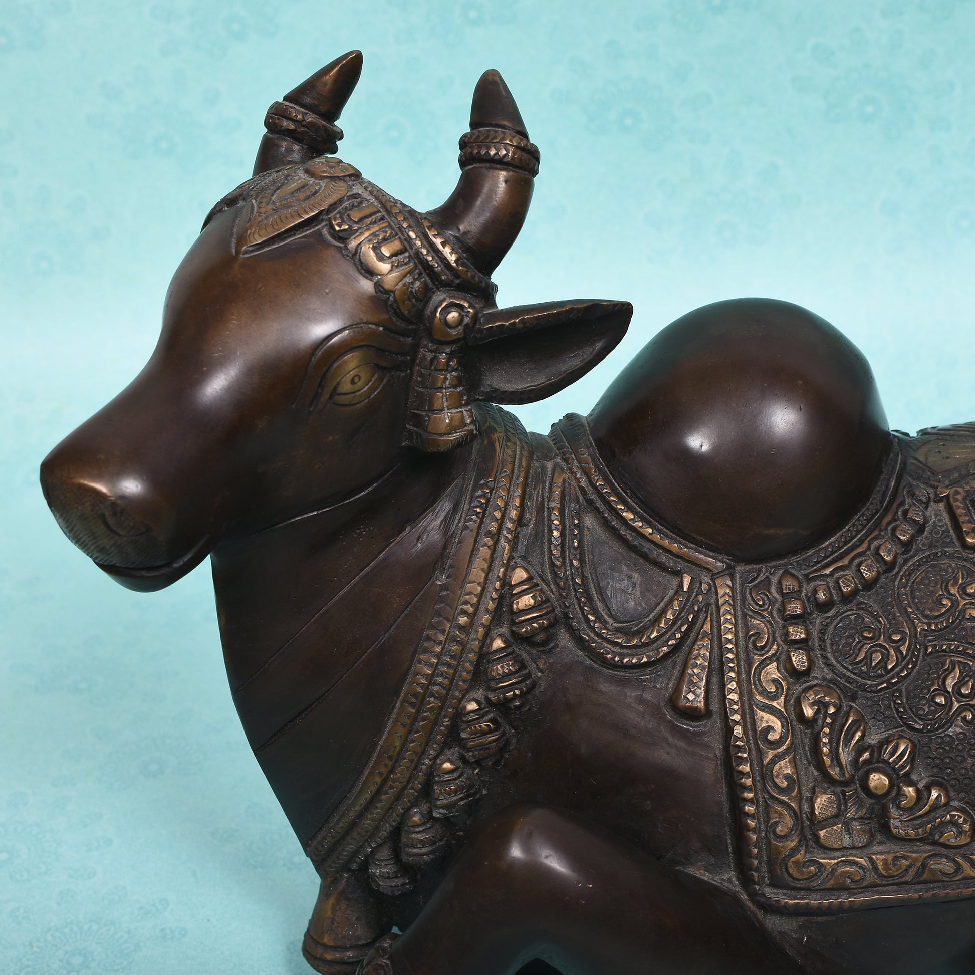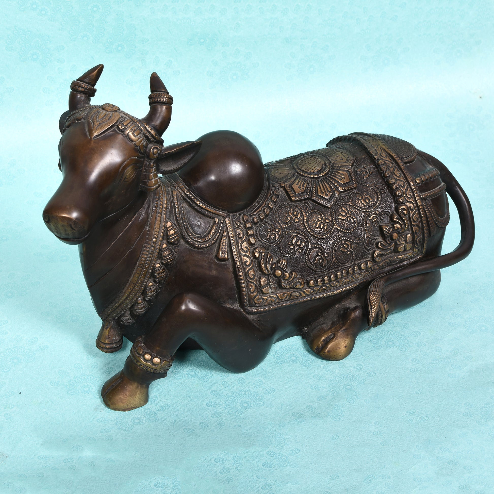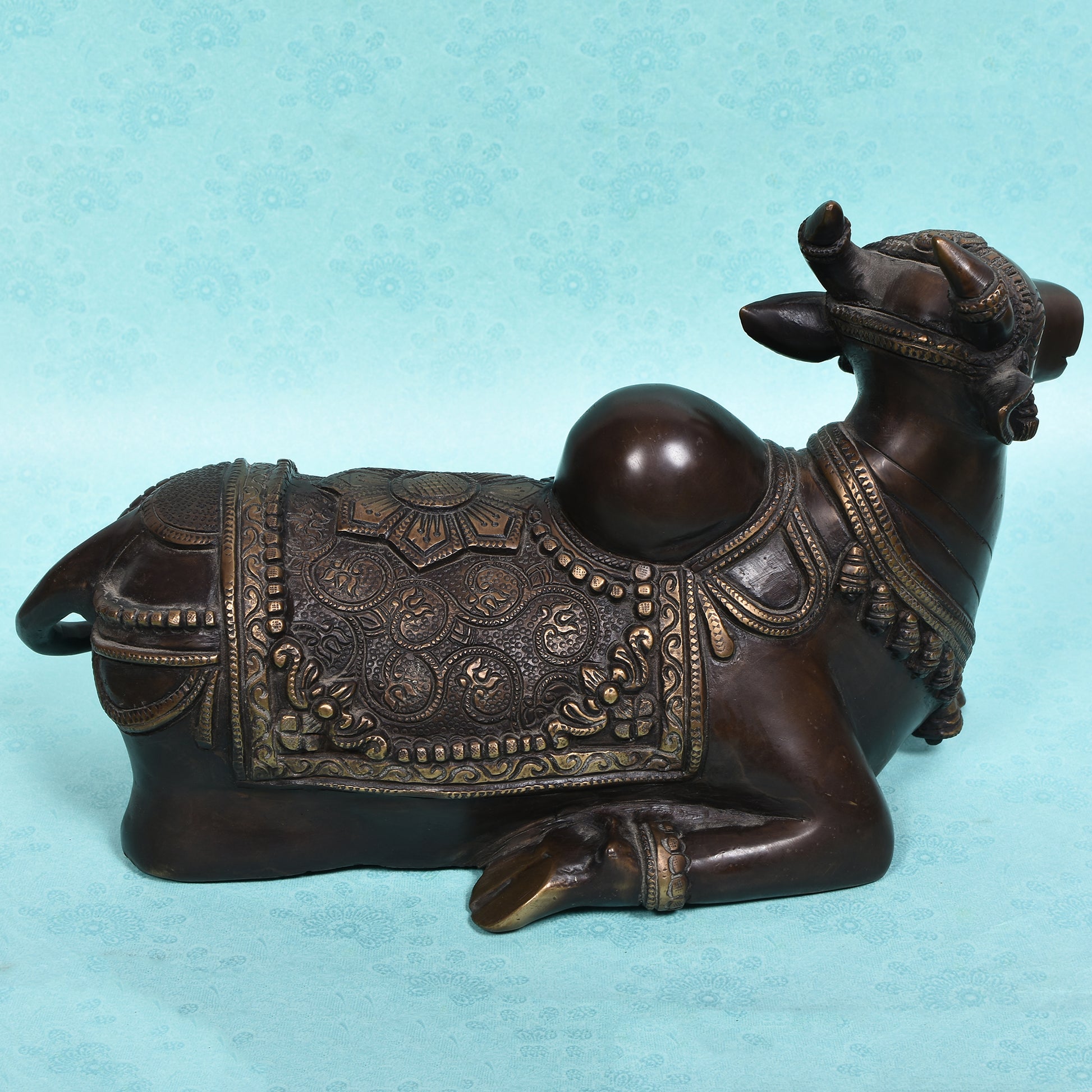 Measuring 15 inches in height and 9 inches in width, this sculpture is a perfect size for an altar, meditation space, or as a striking decorative piece for any home. The carving showcases the serene and powerful nature of Nandi, revered as the guardian of the divine and a symbol of strength, fertility, and dharma (righteousness).