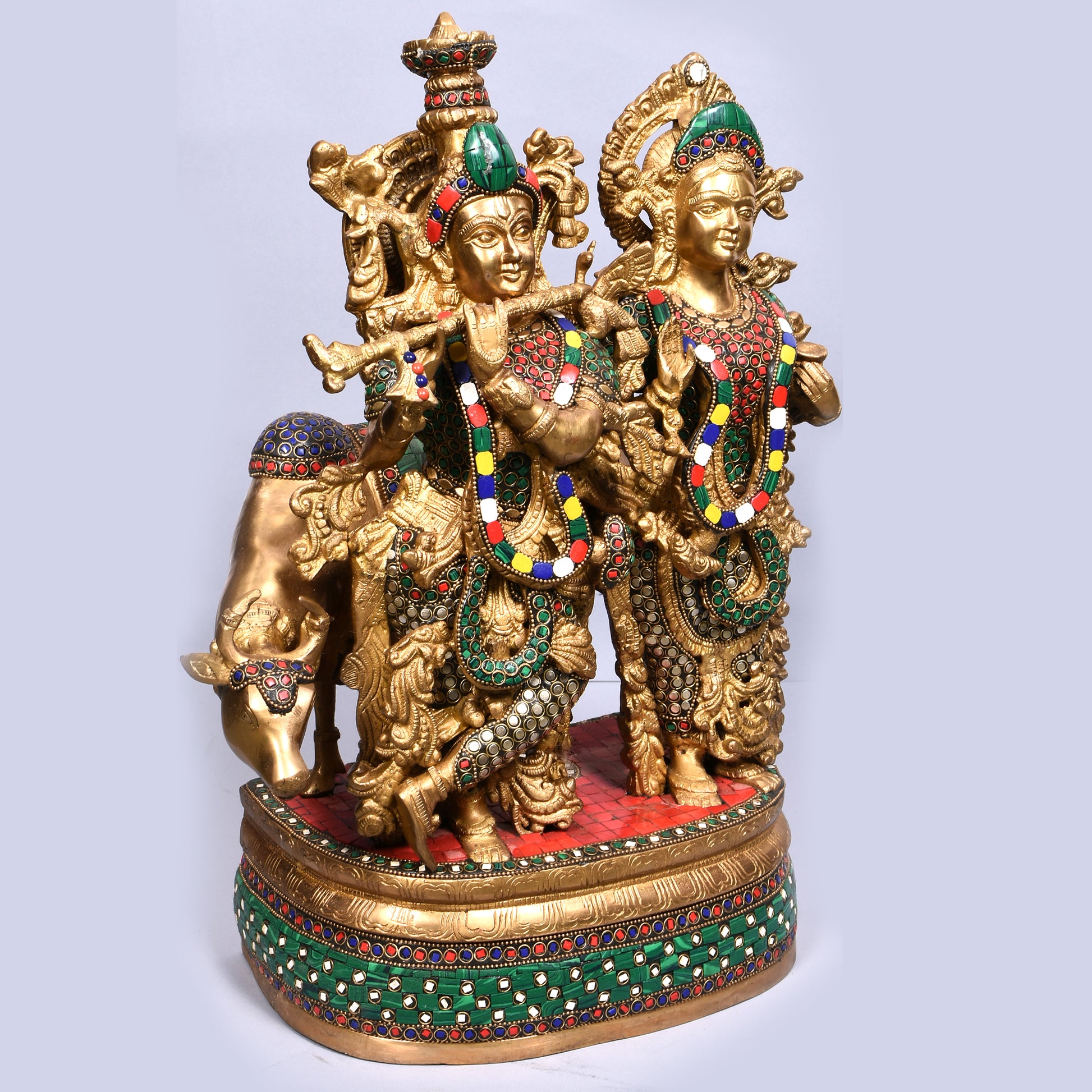 This exquisite 18-inch Radha Krishna statue is a true masterpiece of craftsmanship and devotion. The divine couple is depicted in a standing pose, radiating an aura of love and grace. They stand upon a beautifully crafted designer base that elevates their presence and adds a touch of elegance.
