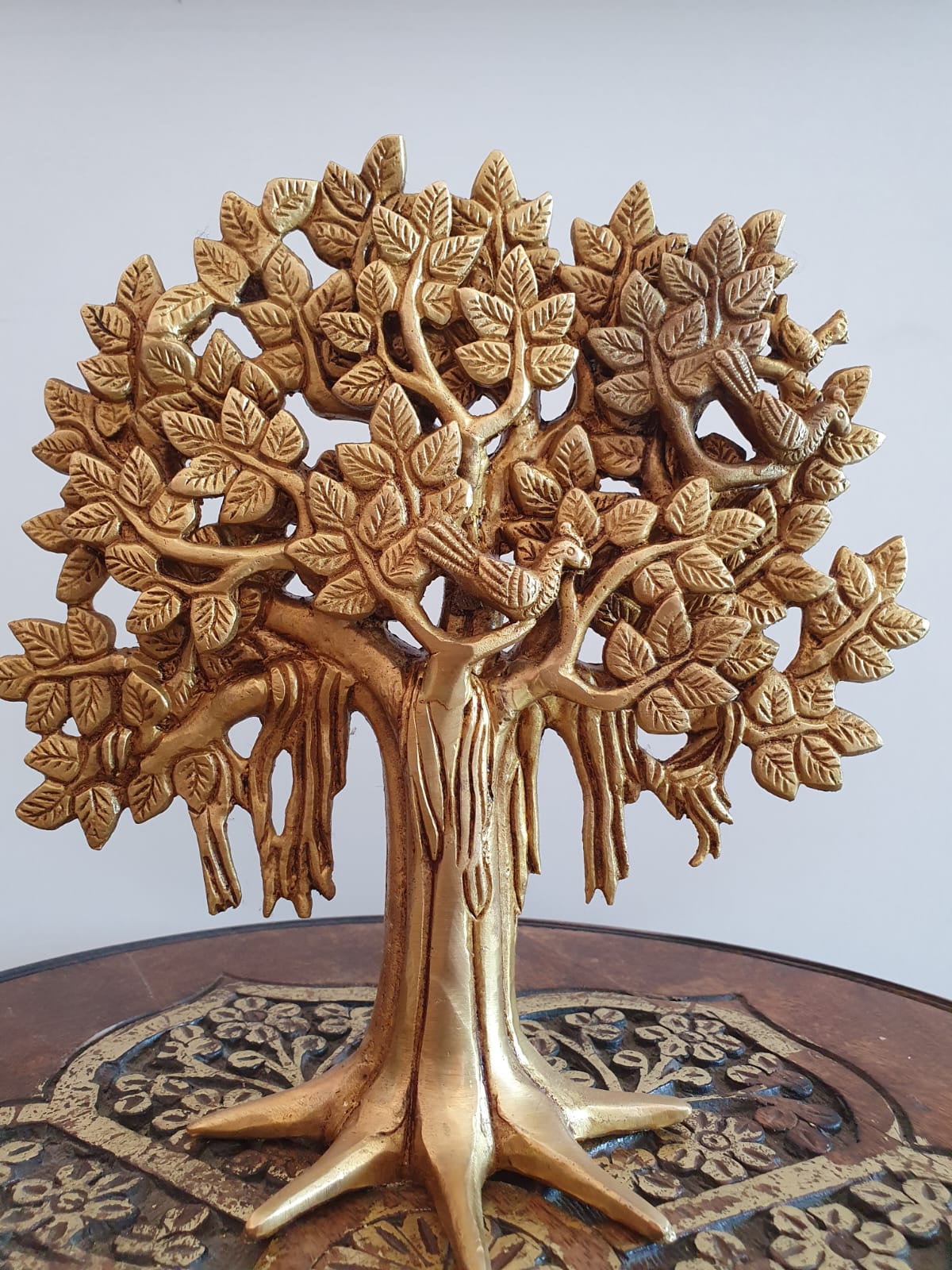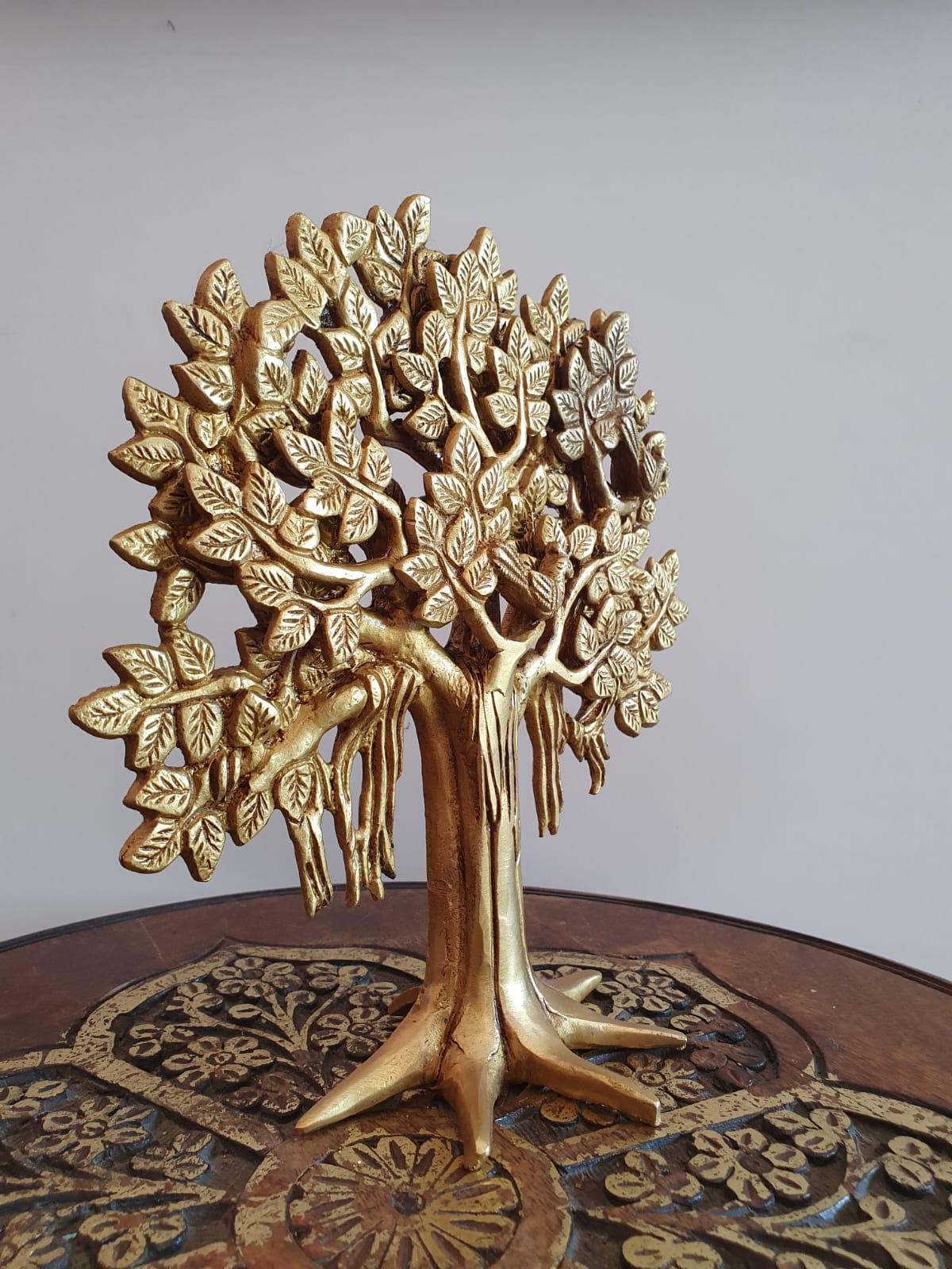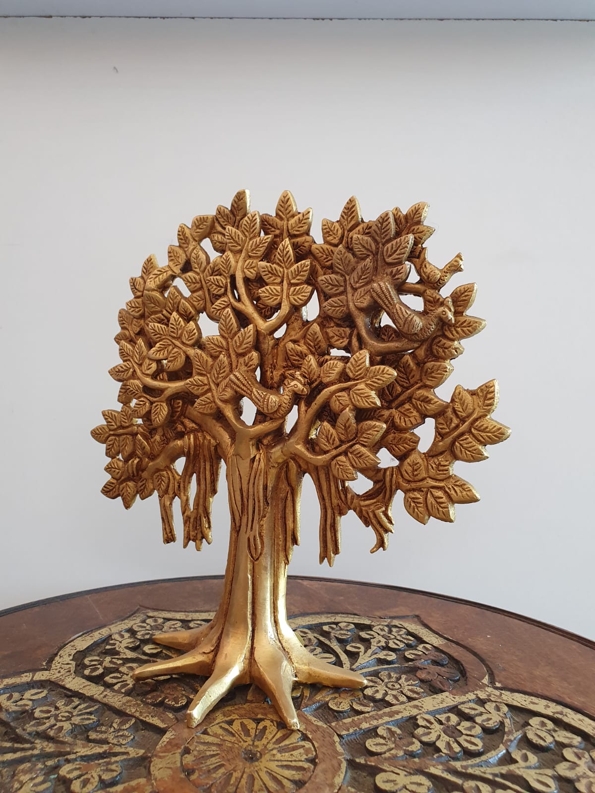Often representing the Tree of Life or the mythical Kalpavriksha (Wish-Fulfilling Tree), this sculpture embodies powerful virtues such as growth, strength, longevity, and prosperity. Its rich, golden hue and fine craftsmanship make it a sophisticated decorative accent that complements both traditional and modern decor styles.