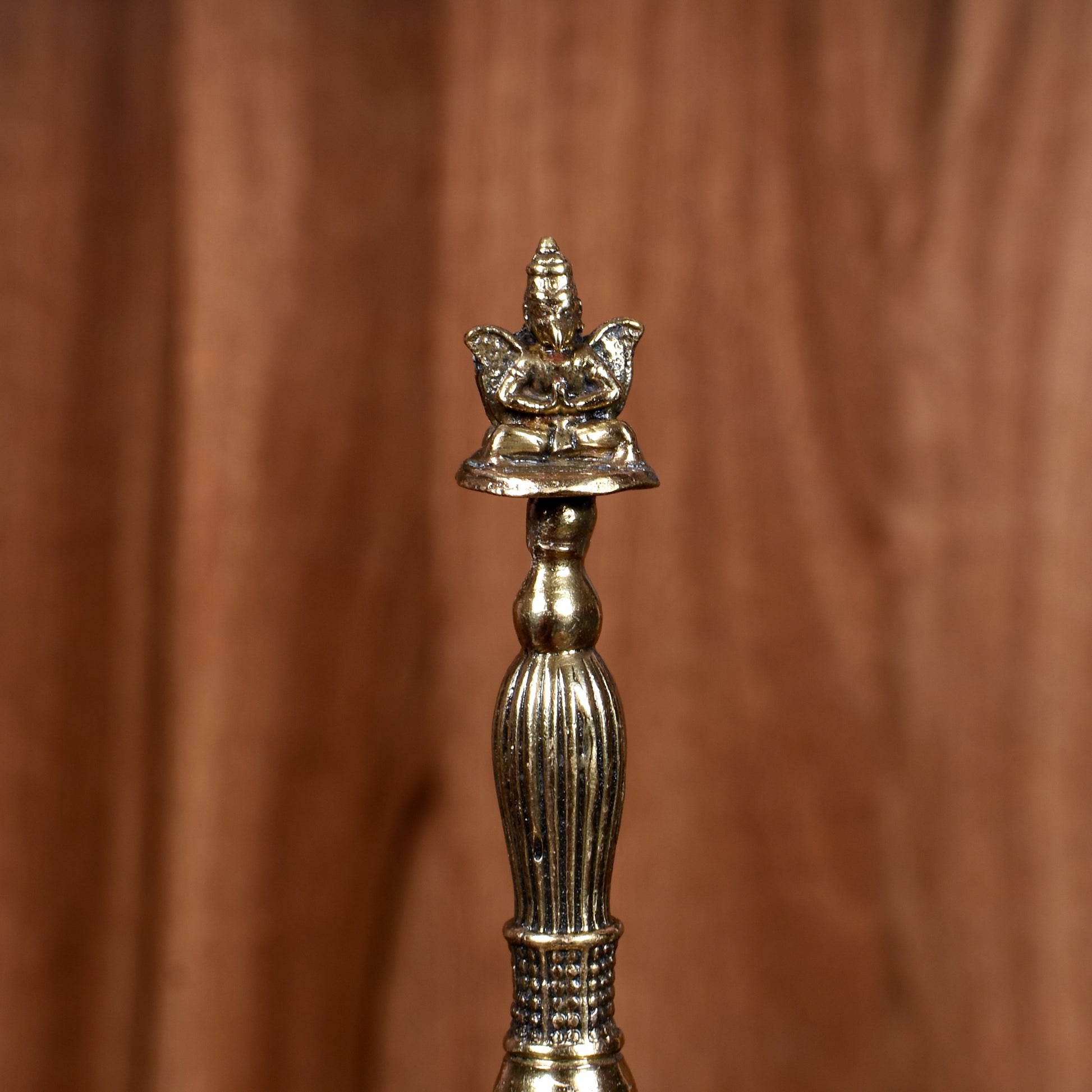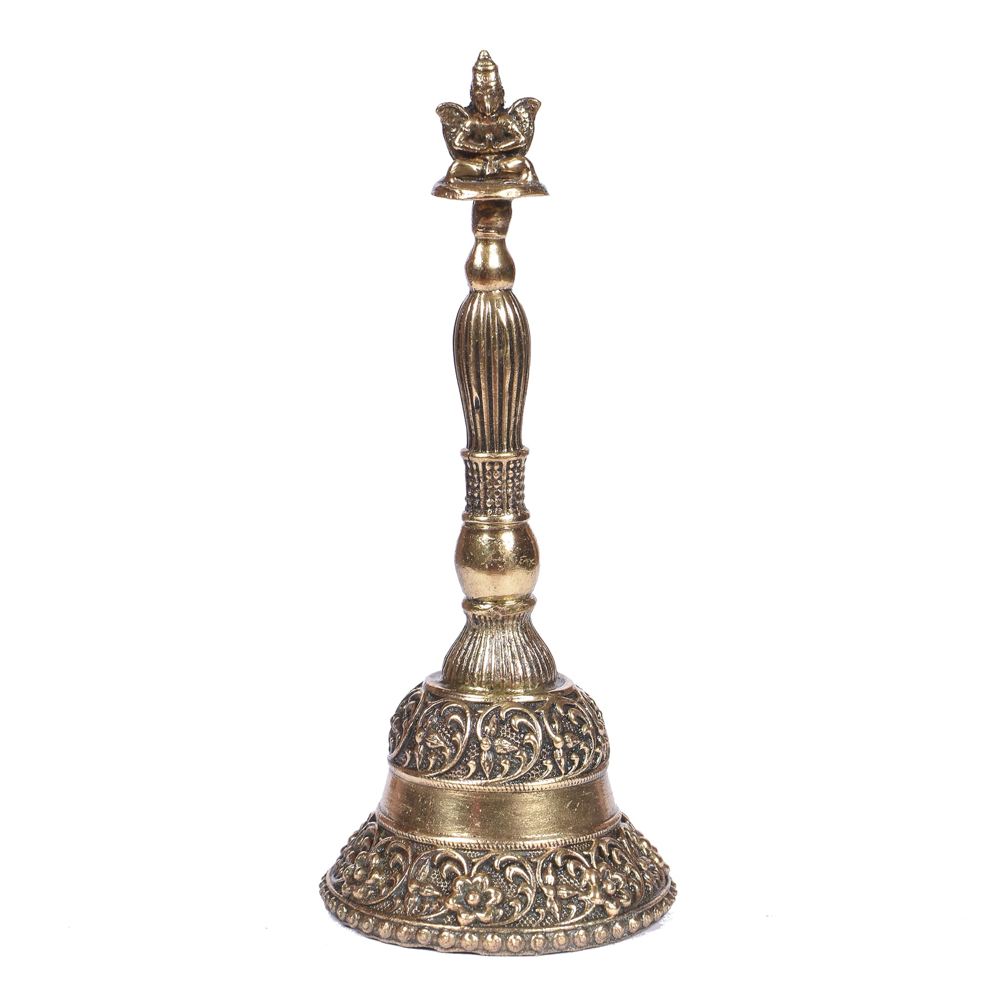Discover the harmony of tradition and craftsmanship with this stunning Brass Hand Bell. More than just an instrument, this piece is a beautiful symbol of divine energy. The handle is intricately sculpted into the form of Garuda, the mythical divine mount of Lord Vishnu, representing power, knowledge, and protection. Crafted from solid brass, this bell produces a clear, resonant tone that is perfect for spiritual rituals, meditation, or simply adding a touch of sacred elegance to your home decor. Its compact 4-inch size makes it a perfect addition to any altar, tabletop, or as a cherished gift.