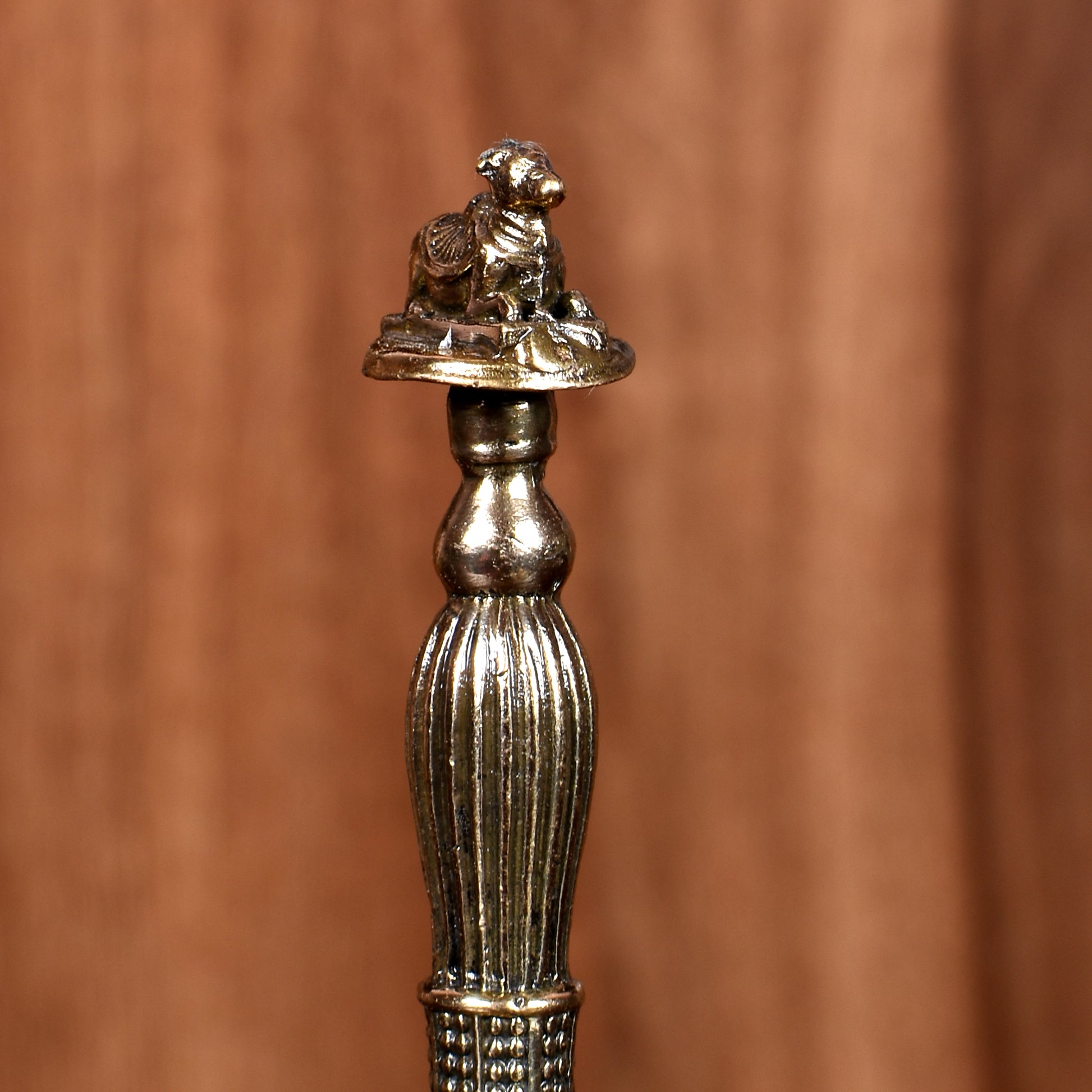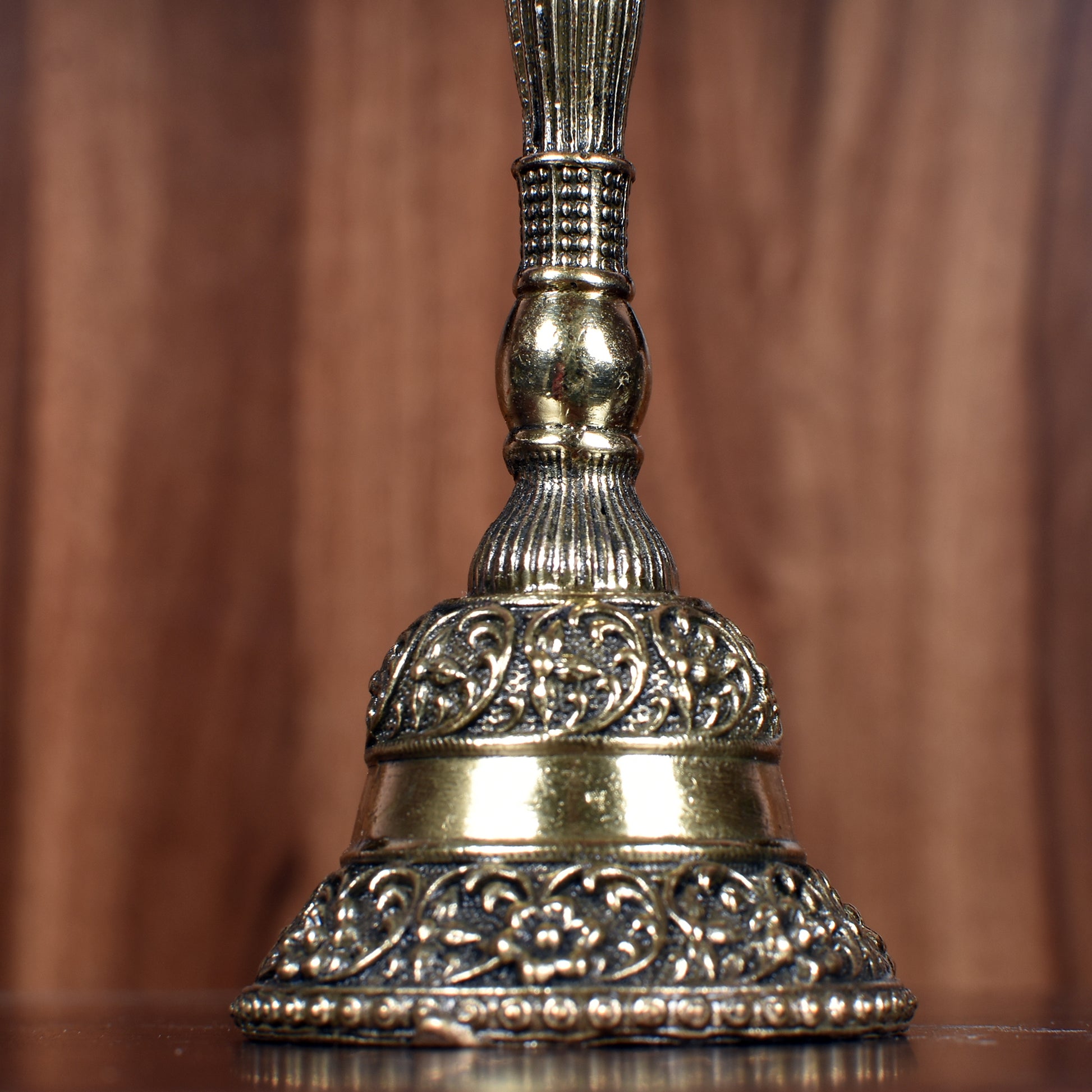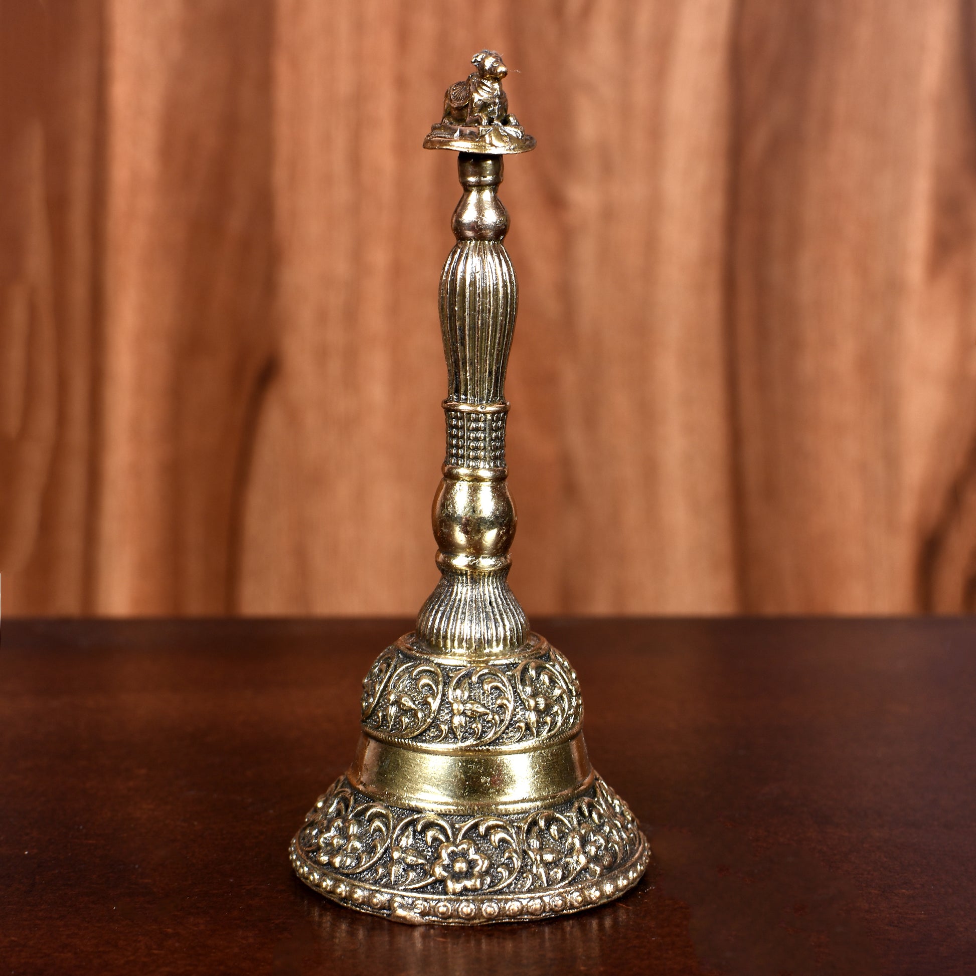 Invoke a sense of tradition and spiritual serenity with this exquisite Brass Hand Bell featuring the revered Nandi. Meticulously crafted from solid brass, this beautiful 4-inch bell is more than just a decorative piece; it is a sacred symbol. The top is intricately detailed with the figure of Nandi, the divine bull and vehicle of Lord Shiva, representing unwavering devotion and strength. Its timeless design and clear, peaceful tone make it a perfect addition to your home altar, prayer room, or a cherished spiritual gift for a loved one.