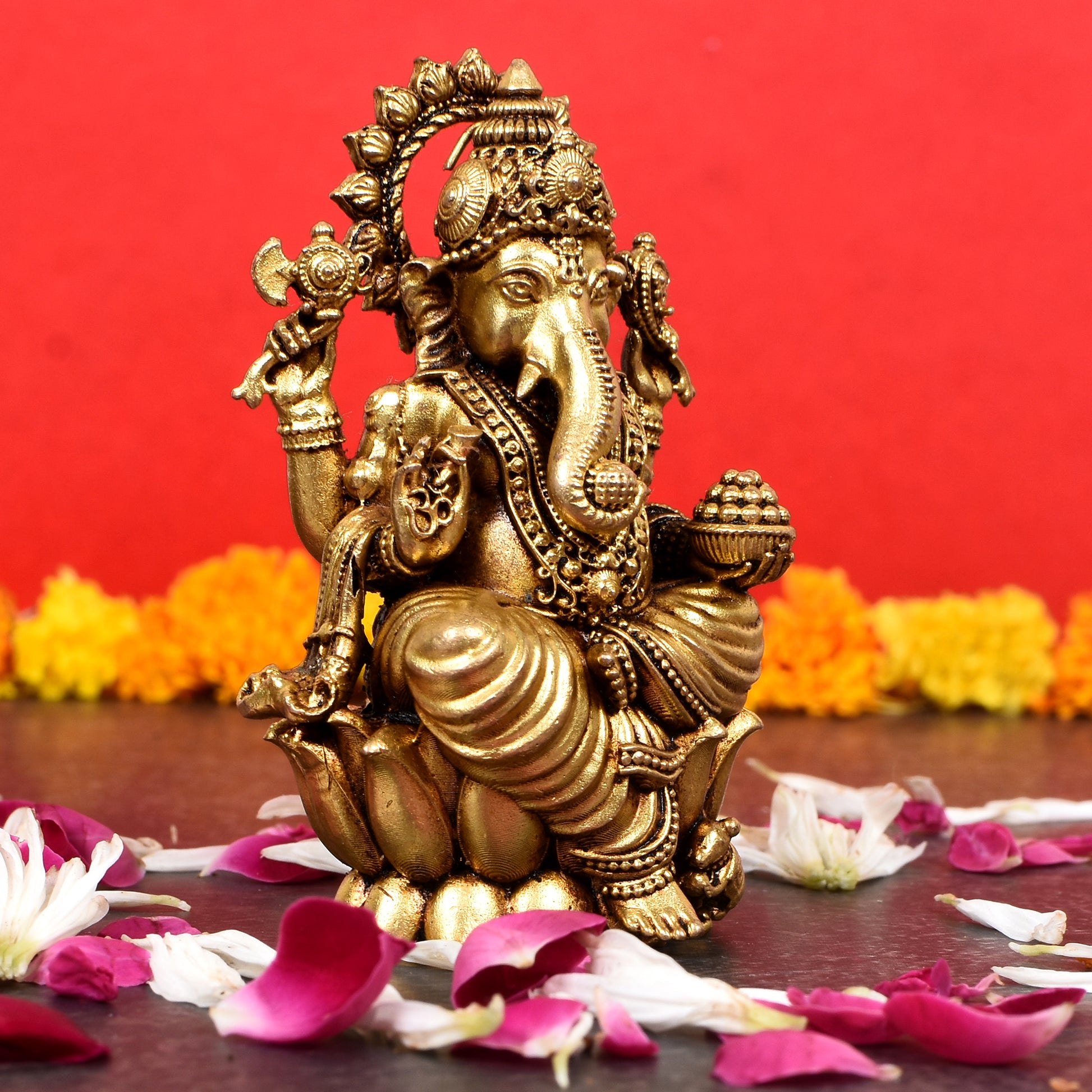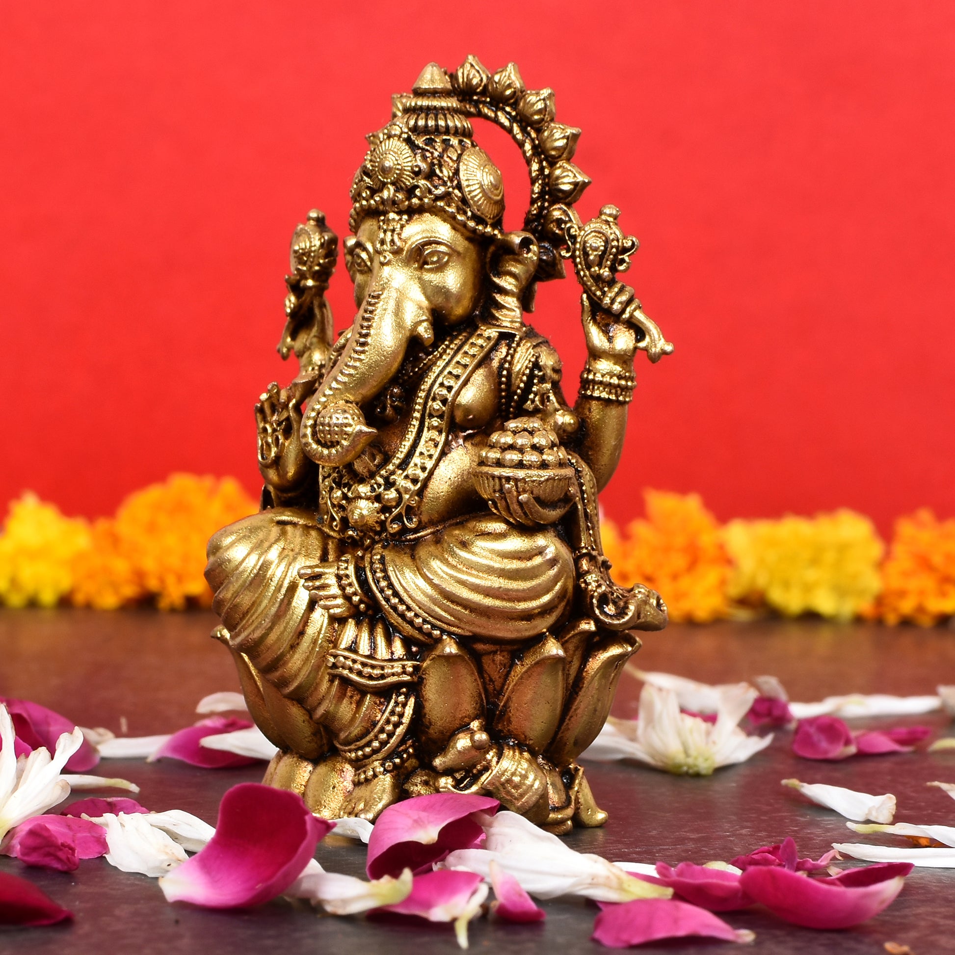 • Golden brass idol of Lord Ganesha in a seated posture.