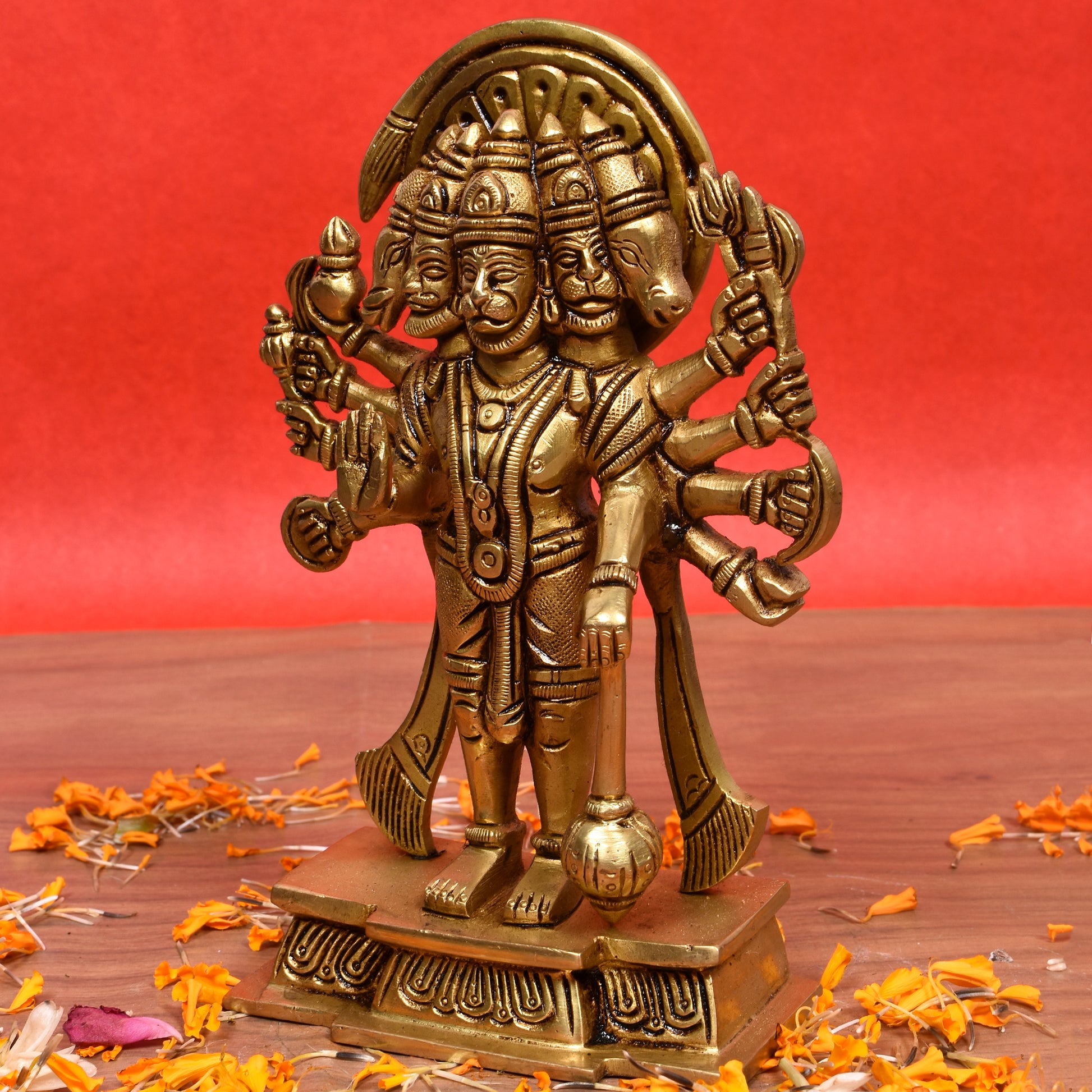 Invoke the ultimate protective power of Lord Hanuman with this magnificent 8-inch standing idol depicting his rare and revered Panchmukhi (Five-Faced) form. This divine manifestation is a symbol of total, all-directional protection, strength, and victory over all challenges and negative forces.