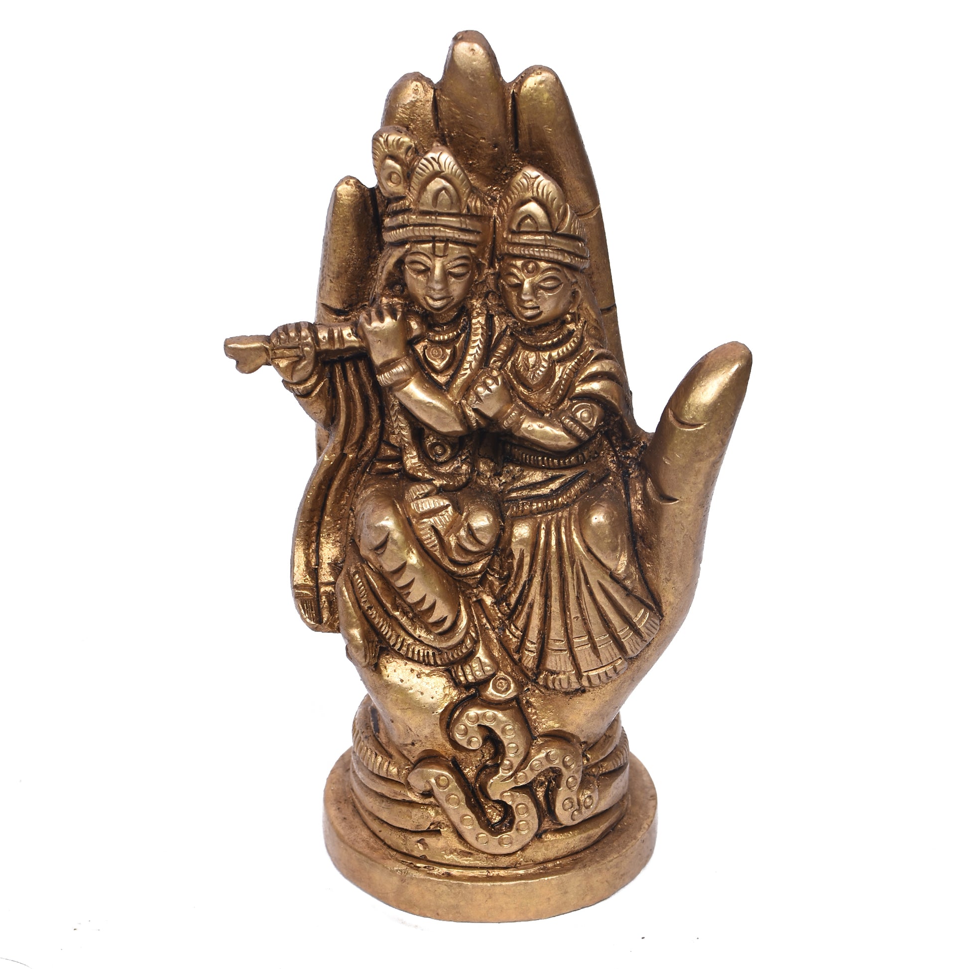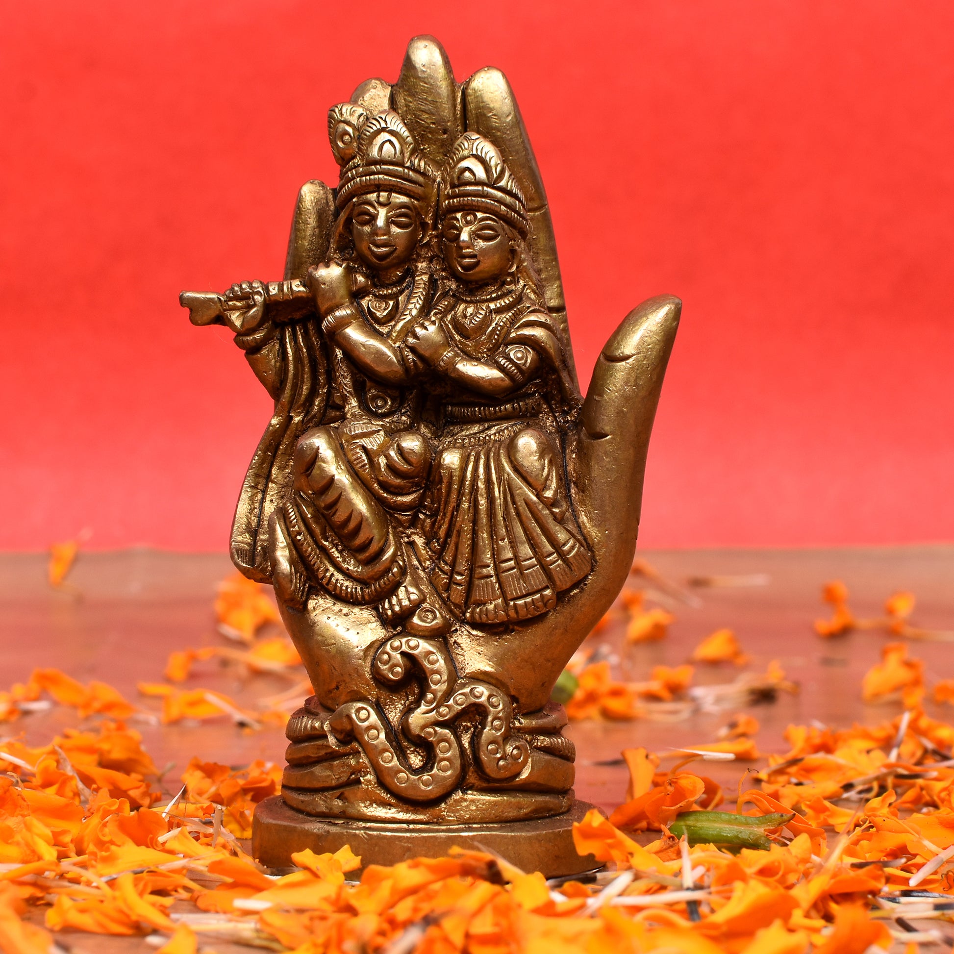 • Design: Captures the revered pose of Radha and Krishna sitting gracefully on a symbolic hand, signifying Divine Protection and Grace.