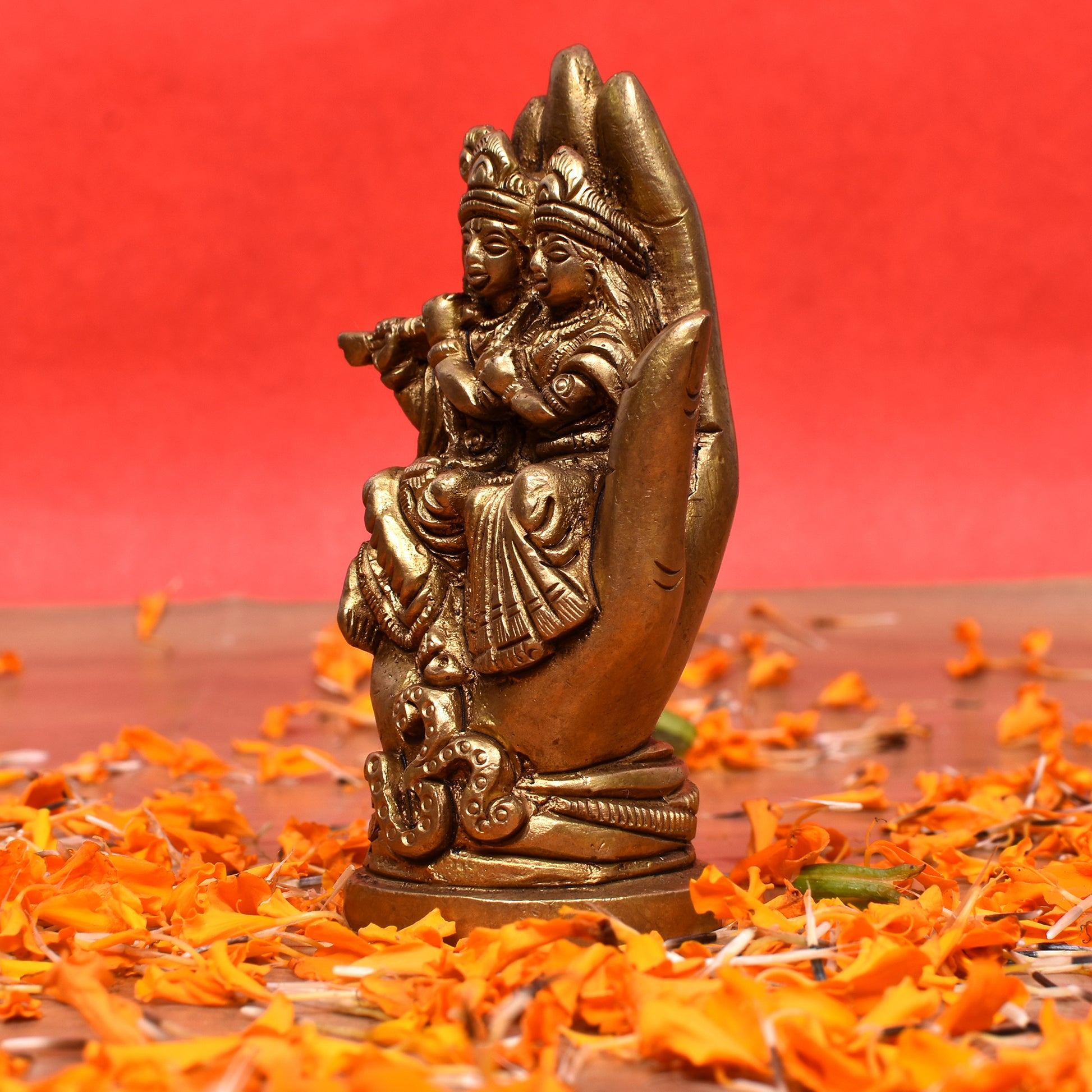 Embrace the essence of divine and eternal love with this exquisite 4-inch sculpture of Radha and Krishna. This unique piece beautifully captures the divine couple, seated tenderly upon a large, symbolic hand, representing divine protection and grace.